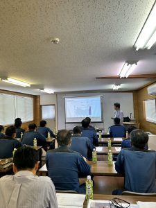 9月26日に、第51期下期の全体ミーティングを開催しました。新設住宅着工戸数が20ヶ月連続で前年同月比割れをする厳しい状況下でいかにこの荒波を乗り越えるのかという大きな課題の下、上期の振り返りと、下期のテーマ(全員で攻めて、全員で守る2.5)と、実施強化事項(1,web発信の強化、2,木の家Re:boneプロジェクトの推進、3,kintoneのシンカ、4,カフェオープン)をみんなで共有し、各部門・各個人の目標を設定しました。ミーティング終了後は「福島牛焼肉牛豊」さんで食事会。おいしいお肉で下期への英気を養いました。