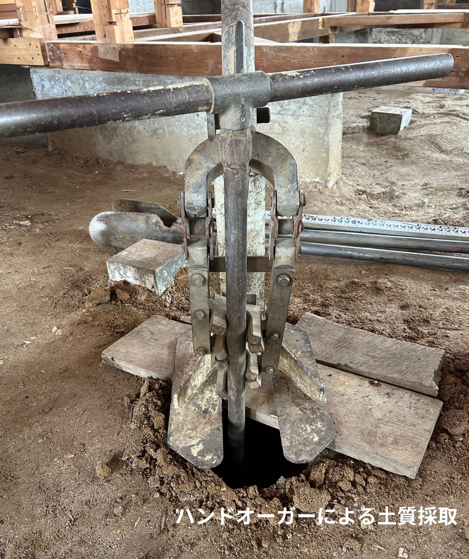 リノベーションをするときに、地盤調査をすることはあまりないのですが、郡山リノベーションモデルハウスの近くに阿武隈川が流れていて、その影響で地盤が良くないはず…。地耐力がどれほどあるのか調査した方がよいと判断し、スクリューウエイト貫入試験(SWS試験)とハンドオーガーによる土質採取をし地盤の状態を確認しました。