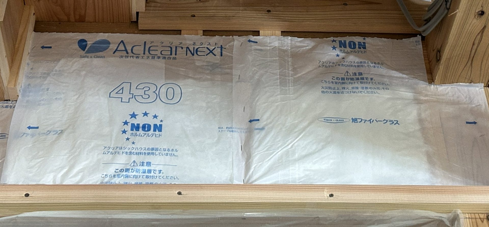 このアクリアは一般的なグラスウールと比べ、耐久性がよく、繊維が細いので絡み合う繊維の本数が多く、同じ厚みでも、高い断熱性を発揮します。また、シックハウス症候群の原因物質であると言われているホルムアルデヒドを含む材料を一切使っていないため、身体にも優しい断熱材です。