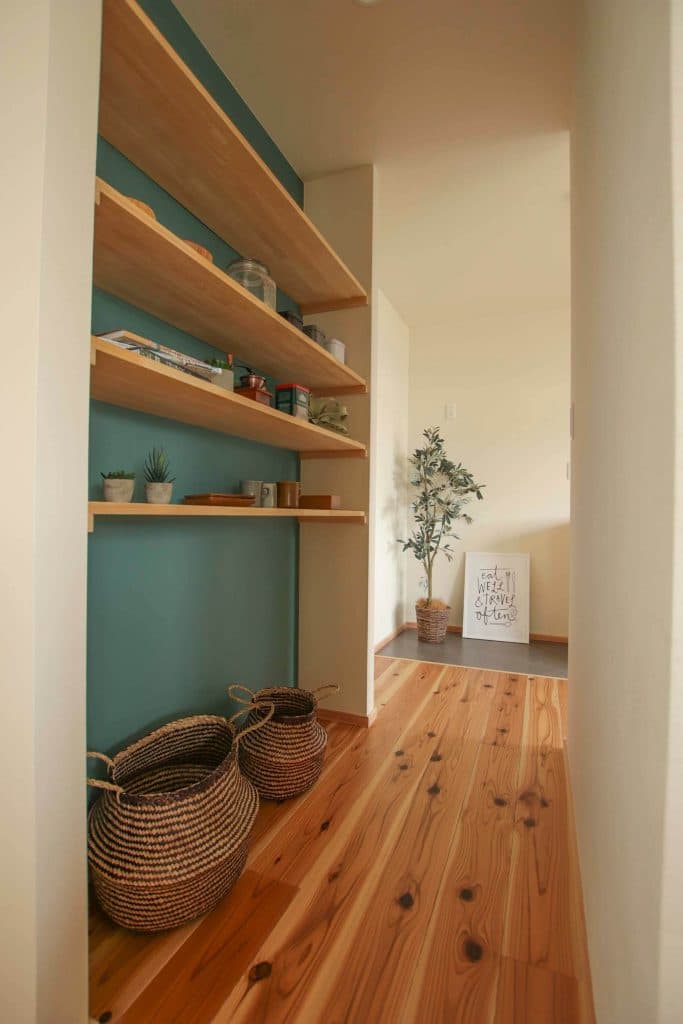 パントリーやファミリークローゼットなど、扉を設けず、動線の中に組み込む収納は、